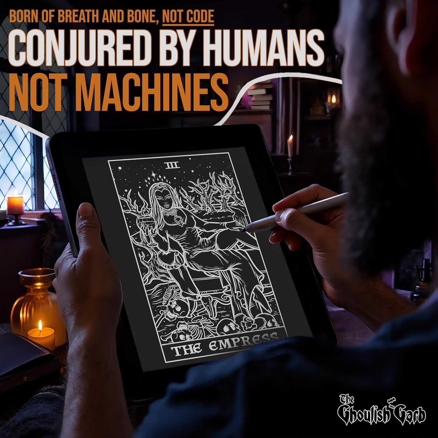 The Empress Tarot Card Tapestry We couldnโt think of anyone better to portray The Empress in our Ghoulish Edition of the card than a seductive vampiress. Above her head sits a crown of twelve stars, representing the twelve zodiac signs and signifying her connection to the metaphysical realm. She is positioned in an open space within nature to express her connection to the natural realm. The seductive manner of her body accompanied by the symbol of Venus around her neck suggests that this vampiress possesses characteristics of feminine fertility and sexuality. This is further embodied in the red shade of the chaise on which she sits. In her right hand, she holds an orb-shaped glass filled with the blood of her most recent victim. The blood represents masculine power, while the roundness of the glass is a feminine symbol for the world over which she rules. The skulls at her feet represent a recent and bountiful harvest for the vampiress. Tapestry Features - Fine Line Detail & Intense Vivid Colors - Printed Top & Finished Edge - 100% lightweight polyester Washing and Drying Instructions - Cold Gentle Machine Wash - Line or Tumble Dry on Low - Donโt Bleach or Iron