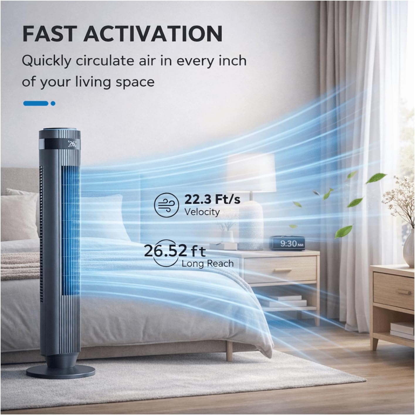 Experience refreshing coolness with our silent tower fan. Operating at just 28 decibels, this bladeless fan provides a peaceful environment for sleep and work. It features a 64-degree swivel function for wide-area air circulation and boasts an impressive air delivery distance of 26.52 feet, with a wind speed up to 22.3 feet per second for efficient cooling. Enjoy customizable comfort with 5 fan speeds and 4 wind modes – Natural, Automatic, Normal, and Sleep – allowing you to adjust airflow to your preference. The built-in 12-hour timer ensures convenient operation with automatic shutdown, while both a sensitive touch panel and long-range remote control offer versatile control options. The fan’s compact, 36.6-inch vertical design saves space, and integrated features like a child lock and safety guard grille provide added peace of mind for families with children or pets. It includes a convenient handle for portability and a dedicated remote control storage slot. This tower fan combines powerful performance with energy efficiency, making it ideal for bedrooms, offices, and living spaces. Dimensions: 36.6” height; Power: Standard 120V; Airflow: 26.52 ft; Wind Speed: Up to 22.3 ft/s; Noise Level: 28 dB.