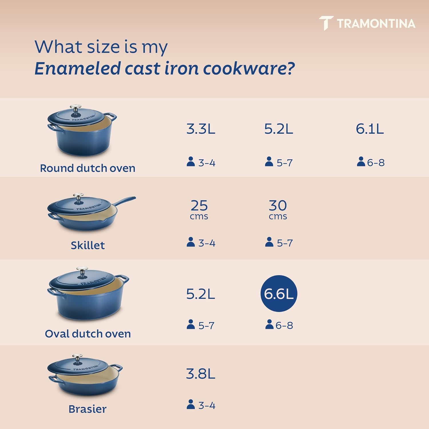 The enameled cast-iron 5.5 qt covered oval dutch oven is part of Tramontina's Gourmet collection of premium products engineered and manufactured with the finest design, materials and workmanship, outperforming similar products within the market and delivering the best quality and value to the cooking professional and enthusiast alike. Prized by cooks for heat retention and even cooking, this enameled cast-iron 5.5 qt covered oval dutch oven will deliver heat slowly so your braised pork chops and chicken-sausage chili serve up incredibly moist and flavorful, as the self-basting condensation ridges on lid uniformly collect and direct vapors onto food. The oval dutch oven also produces outstanding cobblers, Irish soda bread and baked desserts. Sturdy side handles make for secure lifting and transferring of the Tramontina enameled cast-iron dutch oven to your table. The heavy-gauge cast-iron covered oval dutch oven cooking surface is coated with off-white, smooth and easy-to-clean PFOA- and PTFE-free porcelain enamel. Offered in a vibrant, gradated porcelain enamel exterior finish for an elegant kitchen to table serving option. Hand-wash only, compatible with all cooktops and oven-safe to 450 F. This product is assembled and packaged in USA and offered under a lifetime warranty.