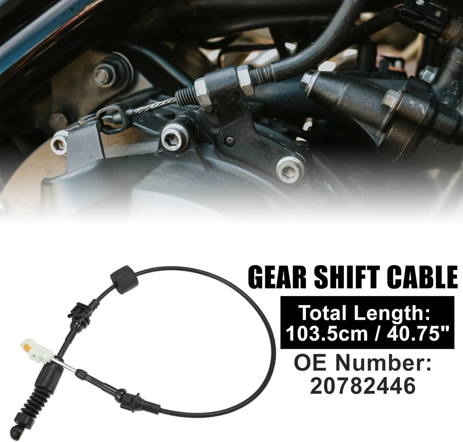 "Dear Customer: Hello! Welcome to purchase our car shift cable. If you have any questions, please to us, and we will answer them for you as soon as possible.Specification:Product name: Car Shift CablePart Number:20782446Total Length: 103.5cm / 40.75"Color: BlackPackage Included:1 x Car Gear Selector Cable"