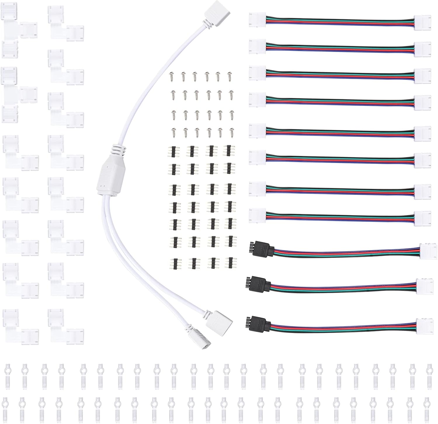 Package Include 30 x Solderless buckles x Double-ended butt cables 6 x turn buckles 60 x 4-pin headers 3 x to two cable 36 x L-shaped corner devices 6 x T-shaped corner devices 60 x 10mm bare board fixing clips 60 x Screws Characteristics - Mini size and lightweight for you to use, portable size that makes it easy for you to take with LED 4 Pin Connectors. - With compact shape, lightweight and portable, take up no space and you can put it anywhere strip light connector. - No need to take a screwdriver and gently bend the prongs up ever so slightly in order for the LED light pin to slide under rgb light connectors clips. - Lightweight design, no pressure to carry, easy to use and easy to operate RGB Connector. -Color:White Connector for RGB LED Light Strip -Material:Plastic LED Connectors kit -Size:17.00X1.50X0.50cm/6.68X0.59X0 led strip connectors. - It is simple in design, but very practical in use, which brings great convenience to you 4 pin led connectors.Goods Descriptionled light connectors The craftsmanship can serve you well without breaking easily.rgb led light strips This is a very practical led strip connector set.4 pin led connectors The led strip connector set is convenient and practical, with excellent texture, and without being easily damaged