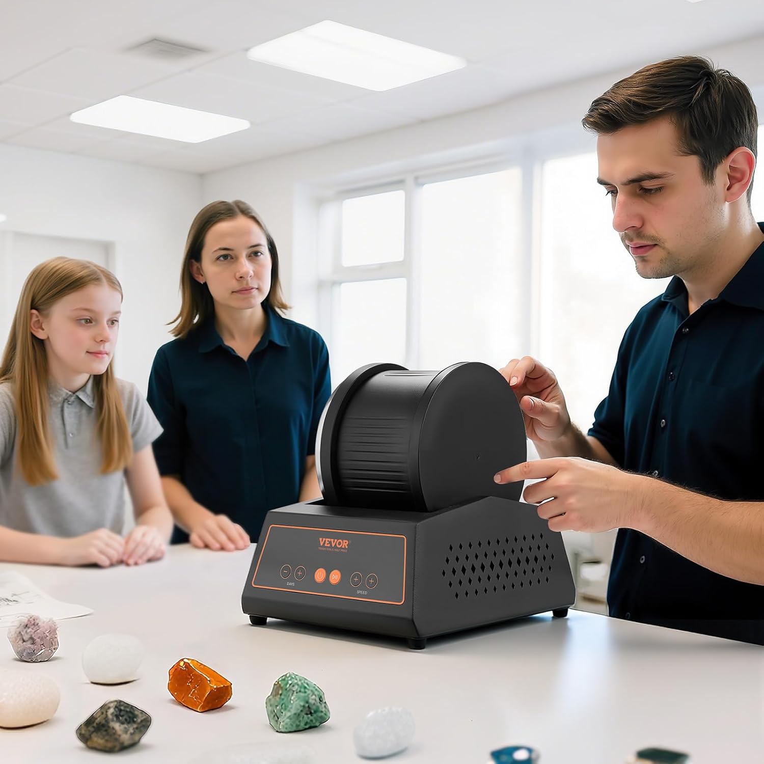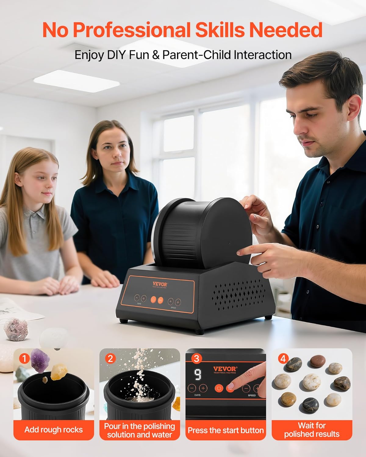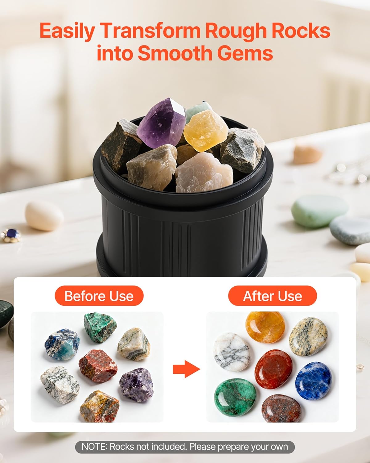 Rock Tumbler KitThis rock tumbler runs on a belt-free direct-drive motor for smooth, quiet (≤35 dB) operation. It provides a 1–9 day timer, 4 speeds, constant polishing speed, overload protection, and power-off memory for confident use. The 4 lbs barrel boosts capacity and efficiency, while the simple design makes polishing easy and fun. Key FeaturesRock Tumbler KitThis rock tumbler kit features a direct-drive motor for smooth and quiet operation and durable materials for long-lasting use. It offers 1–4 speed settings to meet different grinding needs. The large-capacity barrel holds more rocks to boost efficiency, Ideal for hobbyist and professional users! Low-Noise OperationThis rock polishing kit runs as low as 35 dB, similar to a quiet library, making polishing quieter and more comfortable. It ensures long use without noise disturbance and offers a peaceful experience for both home DIY and professional use. Precise ControlOur stone tumbler features an intuitive control panel for easy operation. You can set the run time and adjust the speed levels at your will to precisely control the polishing process, ensuring optimal results every time. Multiple ProtectionsThis rock polisher features multiple safety functions for confident use. The large-capacity barrel holds more rocks for higher efficiency, the sealed design prevents leakage, overload protection prevents damage, power-off memory resumes after outages, and the low-voltage design removes shock risk. Fine PolishingThis stone polishing kit uses a multi-stage process to turn rough stones into smooth, delicate pieces. The operation is simple and efficient, requiring no complex steps to achieve refined results. Unleash Your CreativityWhether you are a beginner or an experienced enthusiast, our rock tumbling machine helps you easily craft unique artworks. From rough stones to smooth gems, it brings your creativity and inspiration to life. SpecificationItem Model Number: KD-C3023Net Weight: 7.72 lbs / 3.50 kgProduct Dimensions: 7.01 x 9.06 x 8.27 in / 178 x 230 x 210 mmProduct Dimensions (Without Barrel): 7.01 x 9.06 x 3.94 in / 178 x 230 x 100 mm Package Content1 x Rock Tumbler Kit1 x User Manual1 x Adapter