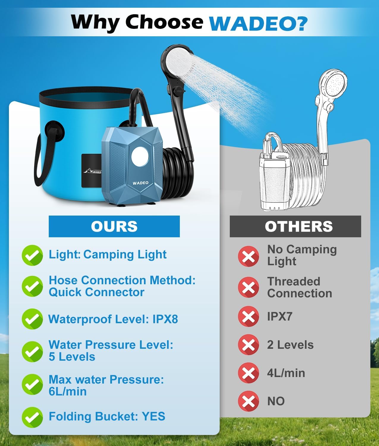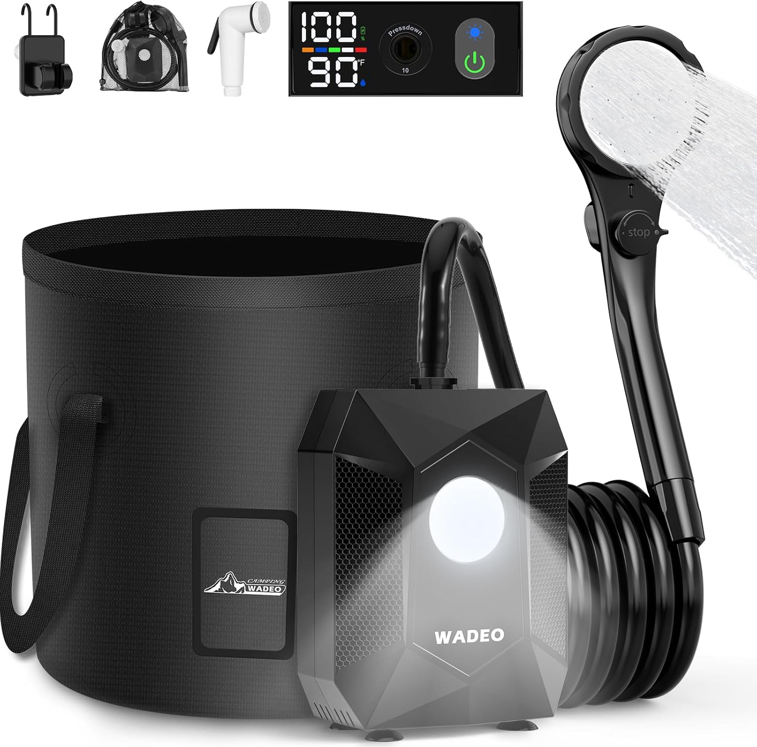 | Included Components | 1 X Camping Shower Pump, 1 X Portable Shower Head, 1 X Camping Shower Nozzle, 1 X 6.5 ft (2m) Hose, 1 X Type-C Charging Cable (NO adapter), 1 X Shower Head Holder, 1 X 3-in-1 Hooks, 1 X 20L Collapsible Bucket |
