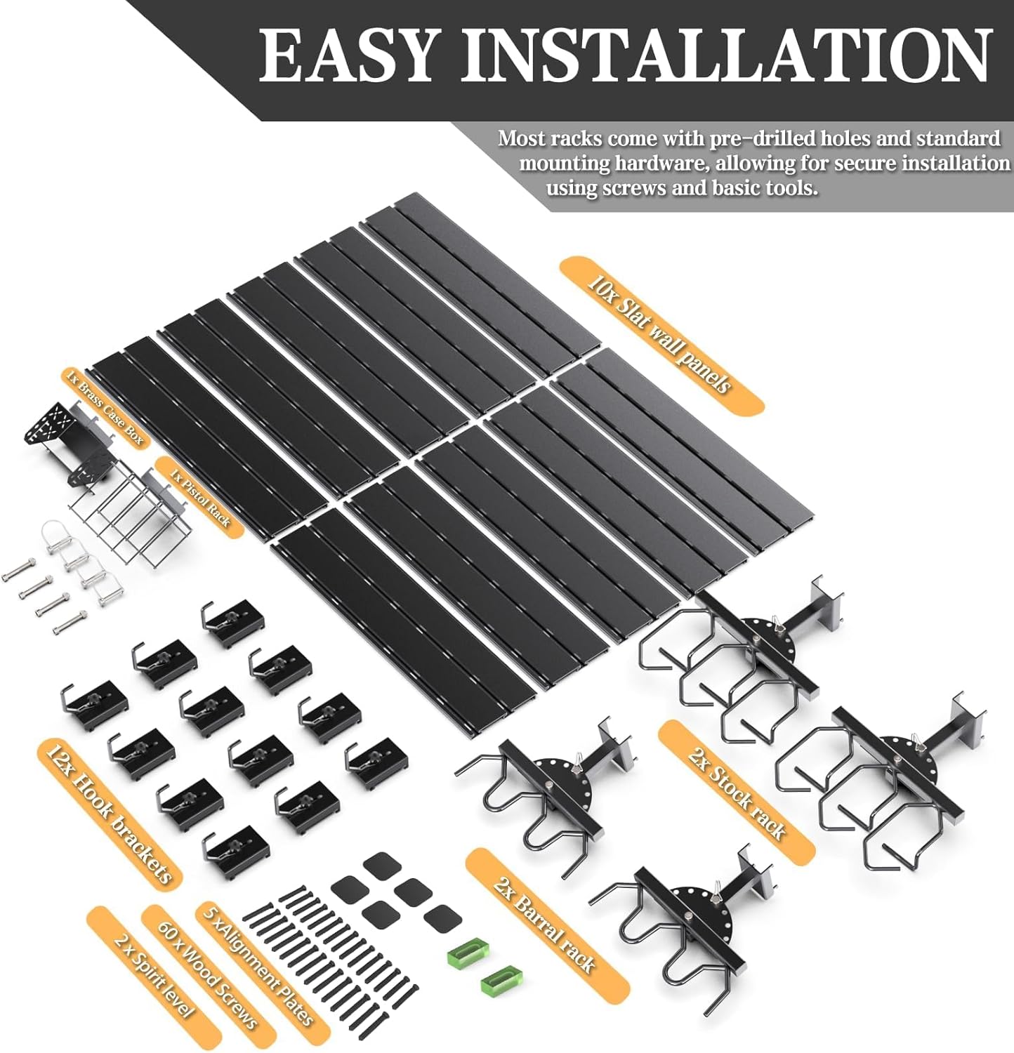 | Included Components | Slat Wall Panels x 10, Barrel Rack x2, Stock Rack x2, J-hooks x 12, Pistol Rack x 1, Magazine holder x 1,Expansion screws x 30,Washer x 30,Mini spirit level x 2,D-ring lock x 4,Screw set x 4 M8 x 65mm,Alignment plate x 5 |