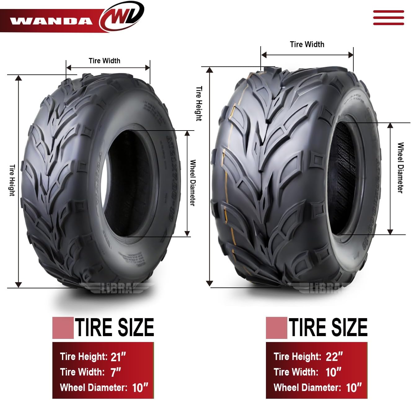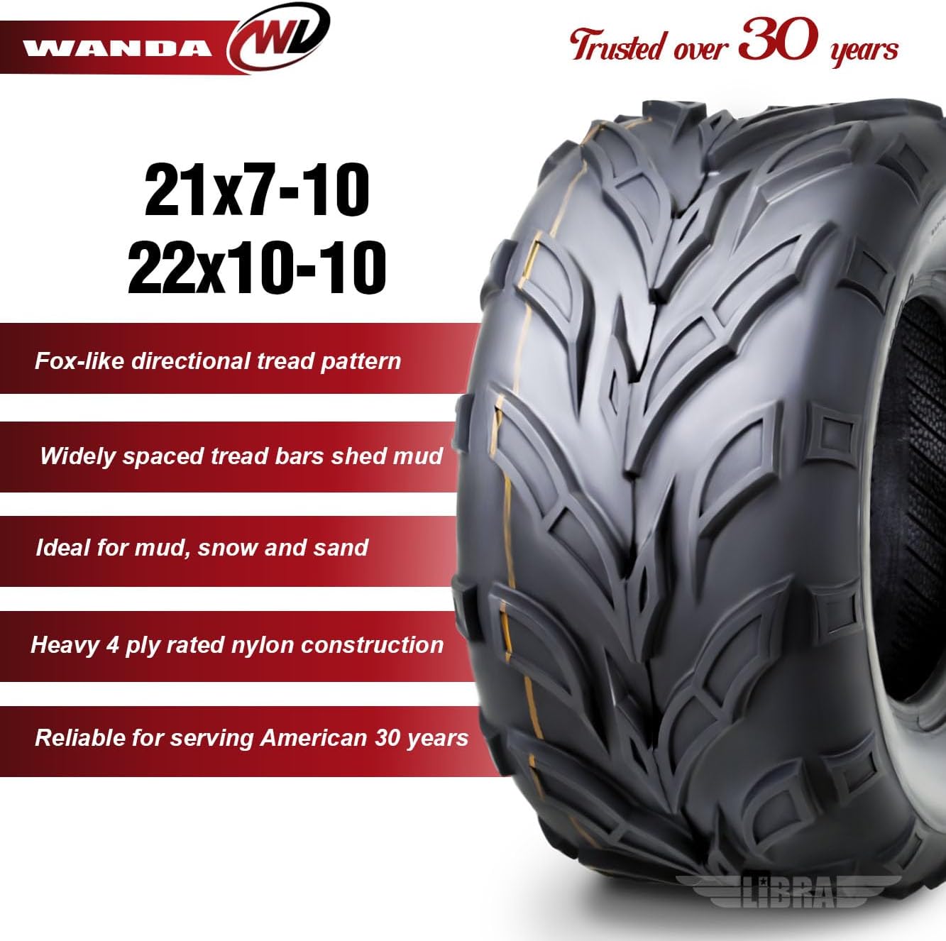 Complete set (2 front + 2 rear) tires for replacement for Yamaha Timberwolf 250 Beartracker. Fox-like directional tread pattern. Widely spaced tread bars shed mud, Iieal for mud, snow and sand. Heavy 4 ply rated construction resists punctures and abrasions. Tires only, wheels not includedTire SpecificationsTire Size: 21x7-10Brand: WANDATread Pattern: P361Ply Rated: 4Tread Depth: 0.5Rim Width: 5.5Max Load: 205lbs@5psiLoad Index: 25Speed Rating: JTire SpecificationsTire Size: 22x10-10Brand: WANDATread Pattern: P361Ply Rated: 4Tread Depth: 0.5Rim Width: 8Max Load: 300lbs@5psiLoad Index: 39Speed Rating: JPlease note: fitment guide is for reference only and does not guarantee the tire will fit your specific model. Please check your owner's manual to ensure proper fitment.