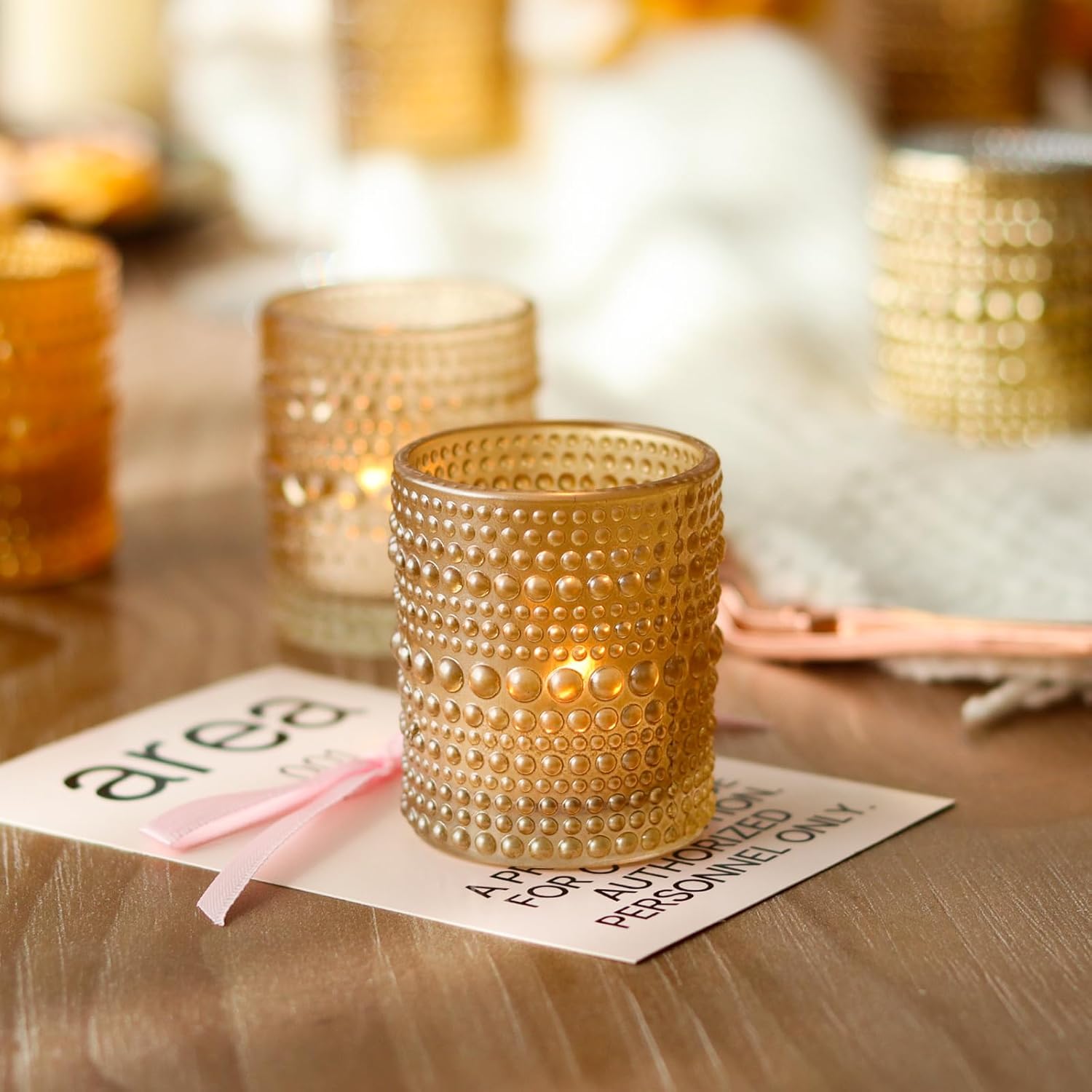 Infuse your space with radiant light and sophisticated charm with our Hobnail Glass Tealight Candle Holders. Radiant Gold Hues, Timeless Texture We've crafted these tealight holders with a luminous gold finish that exudes luxury. Each piece features the classic hobnail texture, designed to catch and refract light, creating a dazzling, sparkling glow that enhances any celebratory mood or elegant setting. Perfect for creating an unforgettable atmosphere for both formal events and everyday elegance: Weddings & Formal Events: Elevate your wedding reception, New Year's Eve party, or anniversary dinner with a radiant, sophisticated glow. Holidays & Celebrations: Add a touch of glamour to Christmas, Thanksgiving, and birthday party table settings. Everyday Luxury: Style your dining table, mantel, living room, or bathroom with these holders to create a luxurious and inviting ambiance every day. A Perfect Gift of Style and Glamour This gilded gold hobnail set is an ideal choice for a bride-to-be, a new homeowner, or a loved one. It’s a gift that combines thoughtful, on-trend design with a touch of practical luxury. Product Details: Content: Choose from a Set of 12 or 24 Glass Hobnail Tealight Candle Holders. Color: Gold Collection. Design: Vintage Hobnail Pattern. Material: Durable Glass with Metallic Finish. Dimensions: 2" D x 2.67" H. Compatibility: Holds standard tealights, votive candles, and LED lights (Candles NOT included). Use: Indoor & Outdoor Decoration.