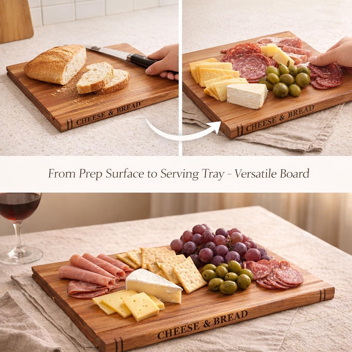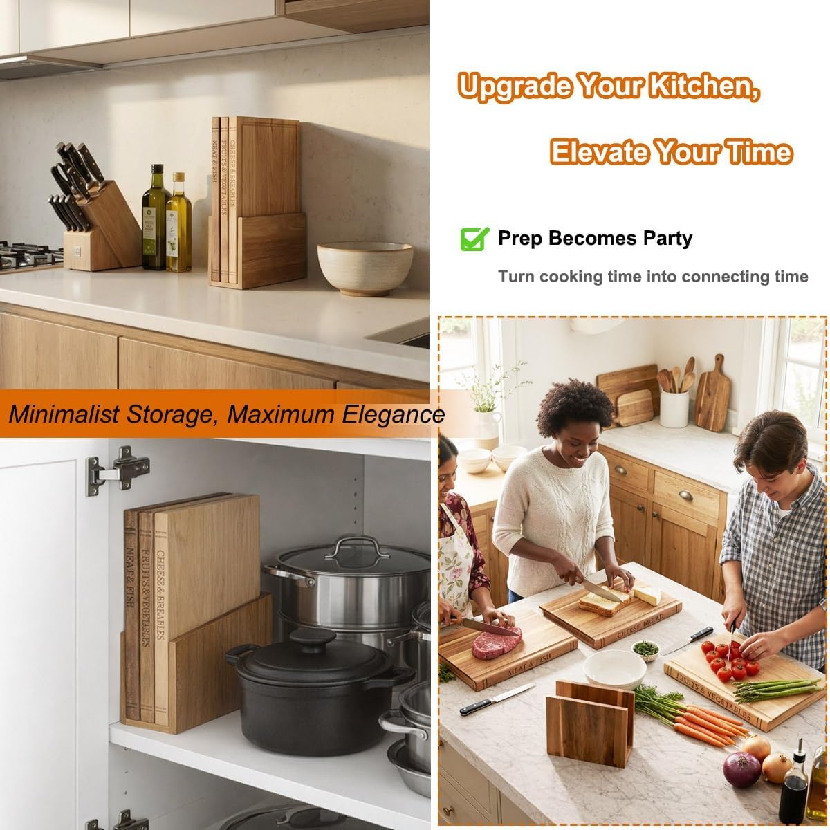 A Gift That Makes Every Kitchen Smarter, More Organized & More BeautifulGive more than just a cutting board—give a complete kitchen upgrade. This elegant 3-piece solid wood cutting set pairs dense acacia with raw meats, fine-grained sapele with produce, and smooth rubberwood with cheeses and breads. Stored vertically in its space-saving book-style stand, it reduces counter clutter while adding natural warmth to any kitchen. Crafted from 100% solid wood with no plastics or chemical coatings, it's the thoughtful, lasting gift that turns everyday cooking into a more intentional and enjoyable ritual—perfect for housewarmings, weddings, or simply treating someone who values mindful living.Product SpecificationsMaterials & CraftsmanshipMaterials: 100% natural solid wood (Sapele, Acacia, Rubberwood)Finish: Food-grade natural wood oil treatmentCraftsmanship: Fine sanded surface, rounded corners, single-sided juice grooveSingle board: 33×25.5×2 cm / 13×10×0.8 inchesStand: 20×8×15 cm / 8×3.15×6 inchesTotal set weight: approx. 3.7 kg / 8 lbsDesign FeaturesLabeling: Permanent etched labels (Meat/Produce/Cheese & Bread)Storage: Integrated solid wood vertical standDesign: Book-style, three-volume setCare & UsageBest for: Home kitchens, gourmet food prep, ingredient separationCleaning: Hand wash recommended with warm water and mild detergentMaintenance: Apply food-grade mineral oil monthlyStorage: Avoid prolonged soaking or direct sunlight; vertical storage recommendedPackagingContents: 3 cutting boards, 1 solid wood standPlease Note: As a natural material, each board has its own character. Variations in wood grain and color are not flaws, but proof of its authenticity—making your piece one of a kind