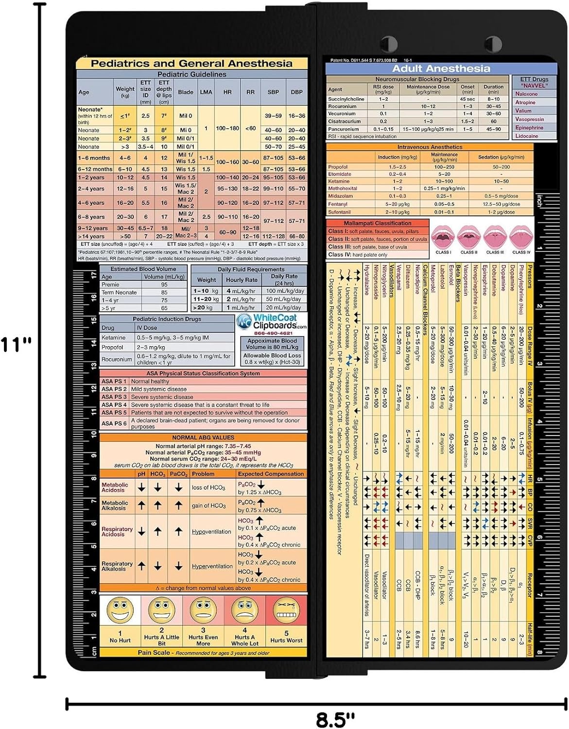 The original WhiteCoat Clipboard that folds in half to conceal all your documents in a HIPAA compliant design. Made of lightweight aluminum with the ability to carry 15 pieces of paper without creasing them, this vertical-folding patented clipboard is great for day-to-day patient care and has our Anesthesia Edition label on the outside for quick referencing. Carry all your patient documents securely without losing your data with this clipboard. The unique design allows the clipboard to fold along the long axis of the clipboard for easy storage and carrying (opposite to our horizontal folding clipboards). The clipboard also functions as a quick medical reference guide with detailed day-to-day information such as acid/base determinations, sedation medications, cardiac pressors, pediatric and adult anesthesia guidelines for intubation, and much more.