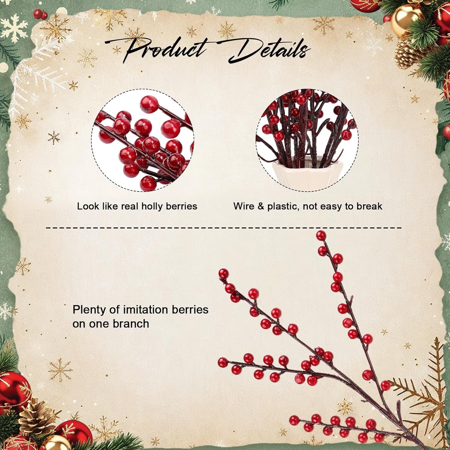 8 Pieces 21.6 inch artificial Claret berry stems Christmas Claret berries holly berry branches for Christmas decor DIY craft Features: Impressing your guest with ease: Use these simple and beautiful Claret berries and stems to make your home warm and lively during the festive season. Invite your friends to a lively party, so that your family and guests can enjoy the fun and make memories. Sprucing up your home: These 8 pieces of beautiful Christmas Claret berries ornaments can make your bedroom, living room and kitchen glow with a warm feeling. The bright Claret color gives you a good visual experience and gives you a pleasant mood at home. You can also use them for DIY, which is a fun parent-child activity to exercise your children's hands-on and imaginative skills. Specification: Material: foam, wire, plastic, Claret coating pigment Color: Claret Size: 21.6 inches Package includes: 8 x Artificial Claret berry stems Notes: Manual measurement, please allow slight errors on size. The colors may exist slight difference due to different screens