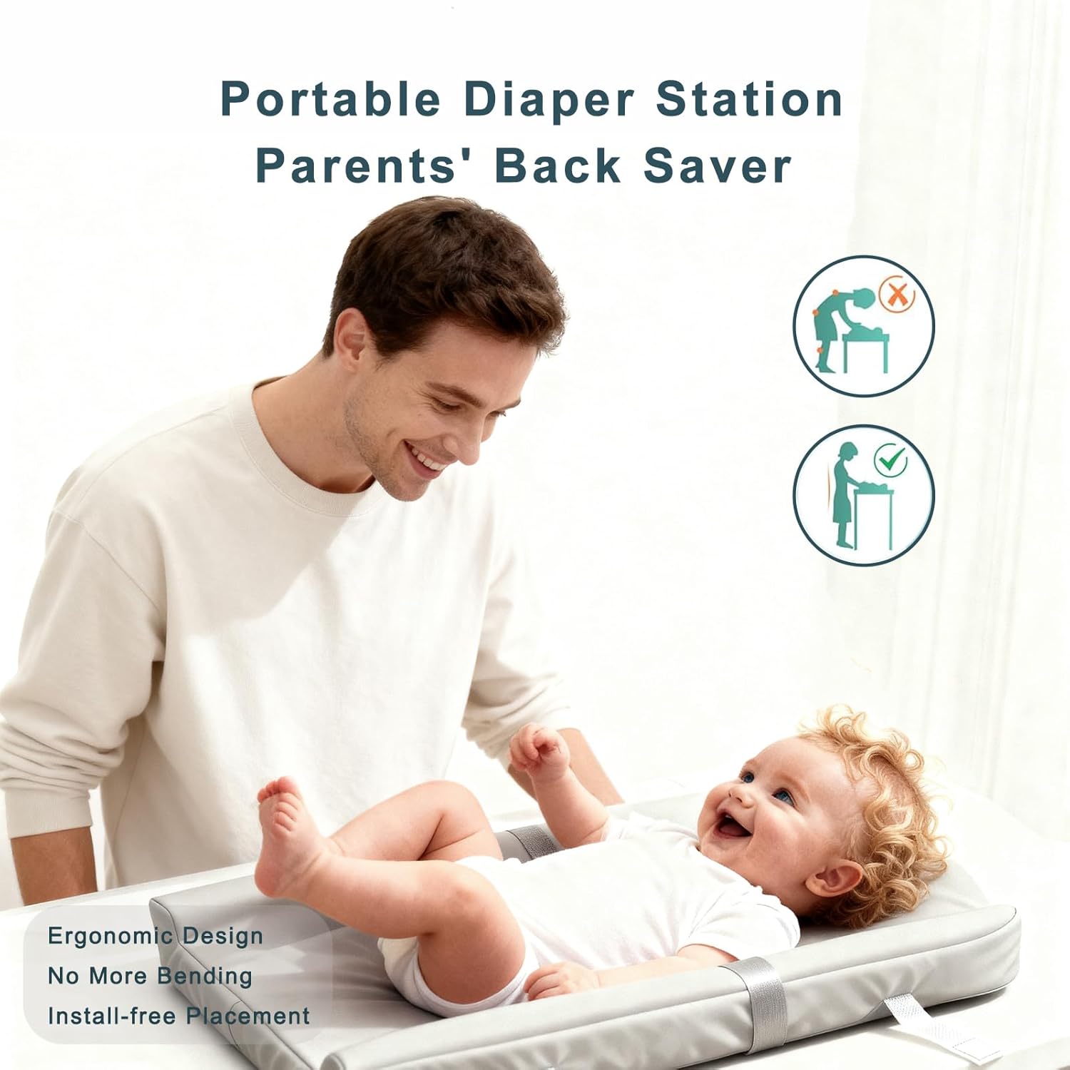🌈Tizoerly Premium Baby Changing Pad, Portable Changing Pad, Diaper Changing Pad. – Trusted Safety Meets On-the-Go Convenience! 🌈Medical-Grade Comfort Kiss diaper-change tears goodbye! Our skin-friendly PU foam cradles your baby’s spine with ergonomic curves. Lab-tested to reduce hip pressure by 40% – watch those tiny feet kick happily instead of squirming. Finally, changes they don’t hate! 🌈Escape-Proof Security System Reinforced adjustable restraining belt (tested to 25 lbs) lock wiggly babies in place. Holds strong through "alligator rolls" on granite countertops, melamine dressers, or RV fold-outs. Safety so solid, it’s earned the nickname "Baby Alcatraz" in mom groups. 🌈60-Second Blowout Cleanup Spills slide right off our stain-proof nano-shield surface. Wipe away poop/puree/vomit with one damp cloth – faster than brewing your morning coffee. *Real-mom verified: 92% less scrub time = more peekaboo time!* 🌈All-in-One Nursery Command Center Generous 31.5" L×15.7" W×3.9" H surface ✅Midnight diaper emergencies ✅Wrestling match outfit changes ✅Spa-worthy massage sessions ✅Messy sensory play 🌟🌟 SPECIFICATIONS: Material: Medical PU foam Size: 31.5" L×15.7" W×3.9" H (Thickness 2") Weight: 0.95kg (2.1 lbs) Color: Gray and Oat
