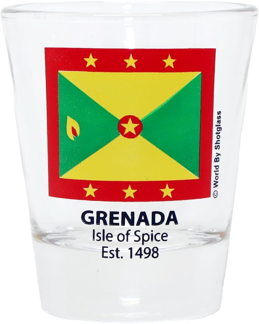 Here's a very rare and hard to find souvenir collectible Grenada Caribbean Boxed Shot Glass Set (Set of 2). It's a 5x6cm style shot glass boxed set measuring 2.25" tall and 1.8" in diameter.