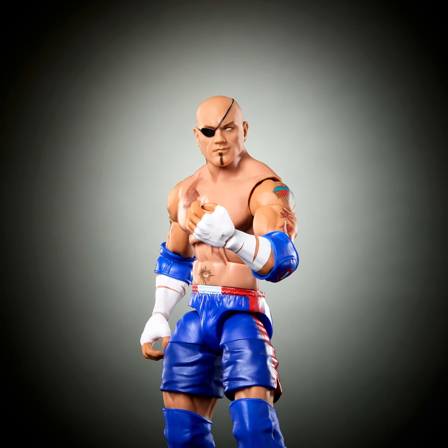Enter the ultimate crossover between WWE and Street Fighter with this spectacular 6-inch action figure that reimagines the iconic wrestler as the legendary Street Fighter character Sagat. This highly detailed collectible features authentic wrestling attire in vibrant blue with red accents, complete with white hand wraps and leg bindings that perfectly blend both character designs. The figure boasts impressive articulation for dynamic pose possibilities, true-to-life muscle definition, and detailed tattoo designs. Part of Mattel's Elite collection, this figure comes with authentic accessories and features the premium craftsmanship collectors expect. The packaging showcases both the WWE and Street Fighter logos in an arcade-style display case design. Perfect for fans of both franchises, this unique mashup figure brings together the best of professional wrestling and fighting games in one must-have collectible. Recommended for ages 8 and up, this figure is a standout addition to any action figure collection.