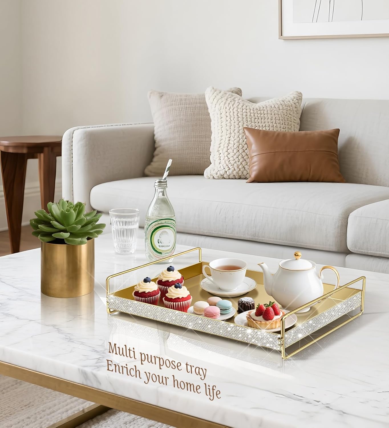 • Multi-functional storage and application - The nightstand tray is made of metal with a gold-plated finish and embedded sparkling glass rhinestones, making it the perfect metal decorative tray. Suitable for various occasions such as bars, restaurants, cafes, offices, and homes, it can be used as a snack tray, drink tray, bathroom vanity tray, bathroom tray, food tray、or cosmetics tray.